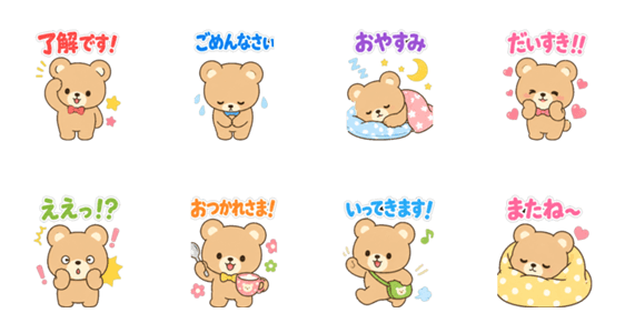 やさしい笑顔のテディベアが、日常の挨拶やリアクションを伝えます。了解・ごめんなさい・おやすみなど、毎日使える定番フレーズ8種。