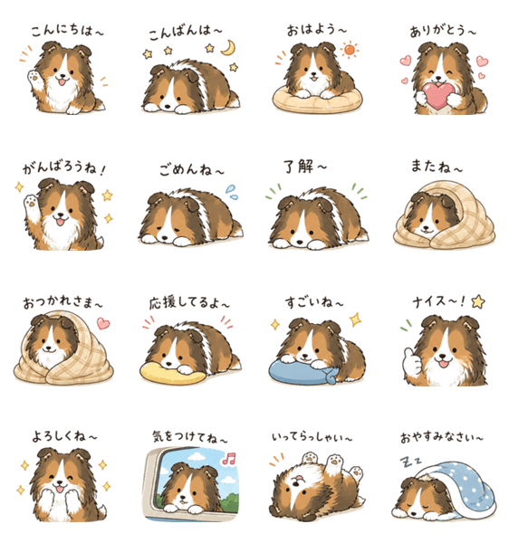 ぐうたらだけど愛されキャラのシェルティが、あいさつや気持ちを届けます。日常会話にぴったりな16種のスタンプです。