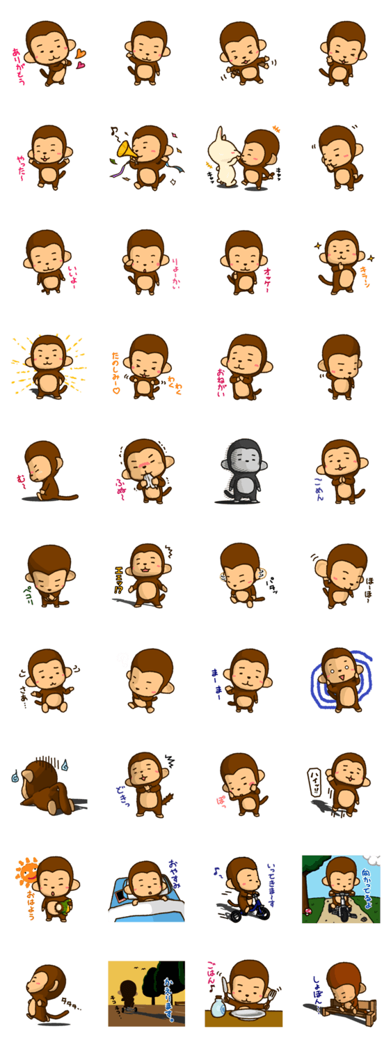 かわいいおさるさんのスタンプです。日常生活でよく使う表現をまとめました。友達や家族との連絡に使って下さい。