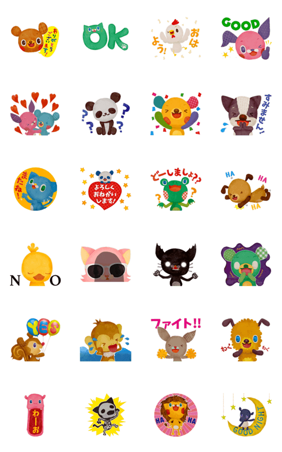 可愛く動く動物たちが、とても使いやすいスタンプになりました。 優しい色合い・楽しい世界観、是非体験してくださいね。 (全スタンプ白ふち付き、背景を選びません)