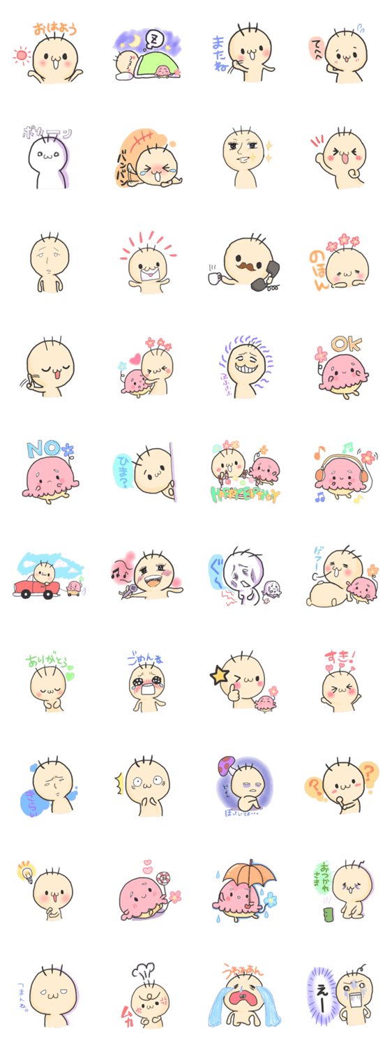 まるいあたまに毛が3本の「まぬ」と、ピンクの頭巾の 「くぽりん」のスタンプです。「まぬ」と「くぽりん」の表情ゆたかなスタンプが会話を楽しませてくれます。
