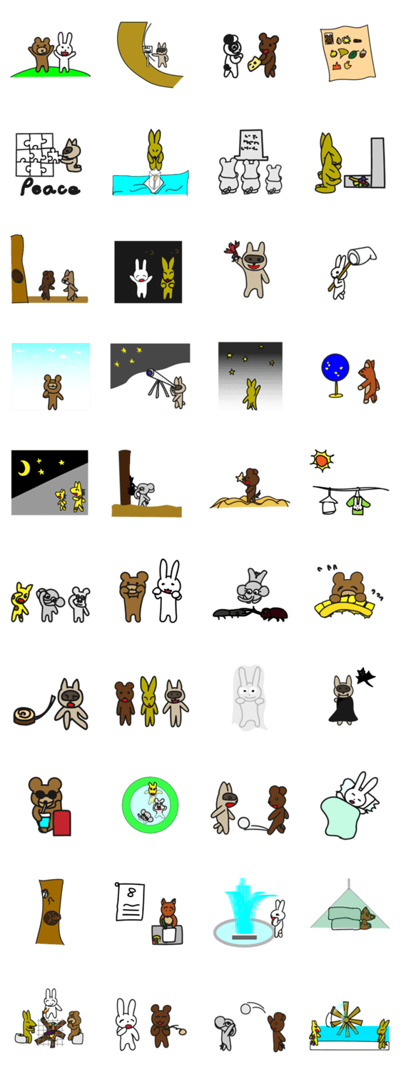 うさぎ、くま、きつね、りす、あらいぐま、しか、きりん、かば、ぞうなどのスタンプです。