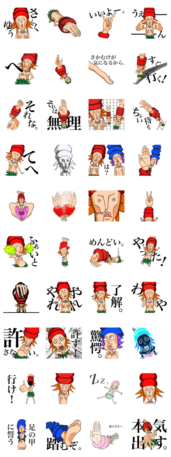 頭に大きな手が生えた「てて族」と、大きな足が生えた「あし族」のスタンプです。てて族は、たまに羽も生えます。
