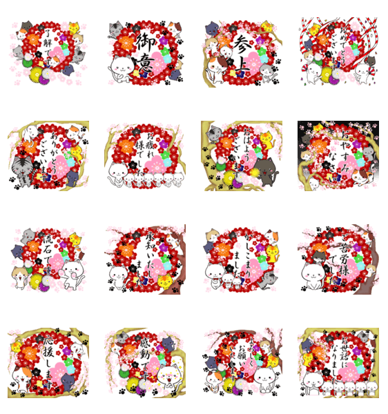花とねこのスタンプです。基本的に敬語で、友達、家族、先輩、上司、彼氏彼女でも使えます。スタンプの数は16個となります。