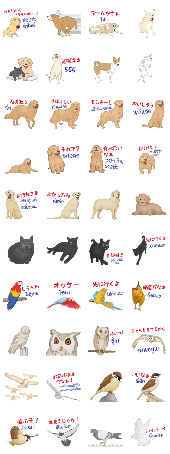 タイのペットたちの気持ち。タイ語と日本語が使えます。勉強できそうなスタンプです。ぜひタイ人や日本人の友達に使ってください。タイの犬、猫、インコなどと楽しんでね
