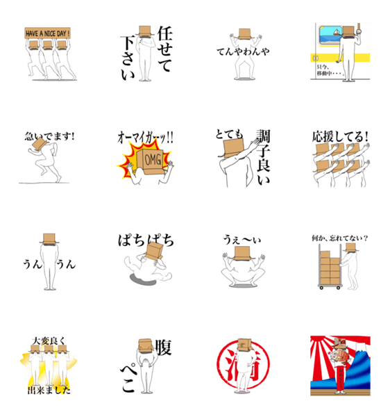 使いやすい言葉が入った、シュールに、活発に、動く段ボールマンのスタンプ第二弾です。仕事から日常まで幅広く使えます。