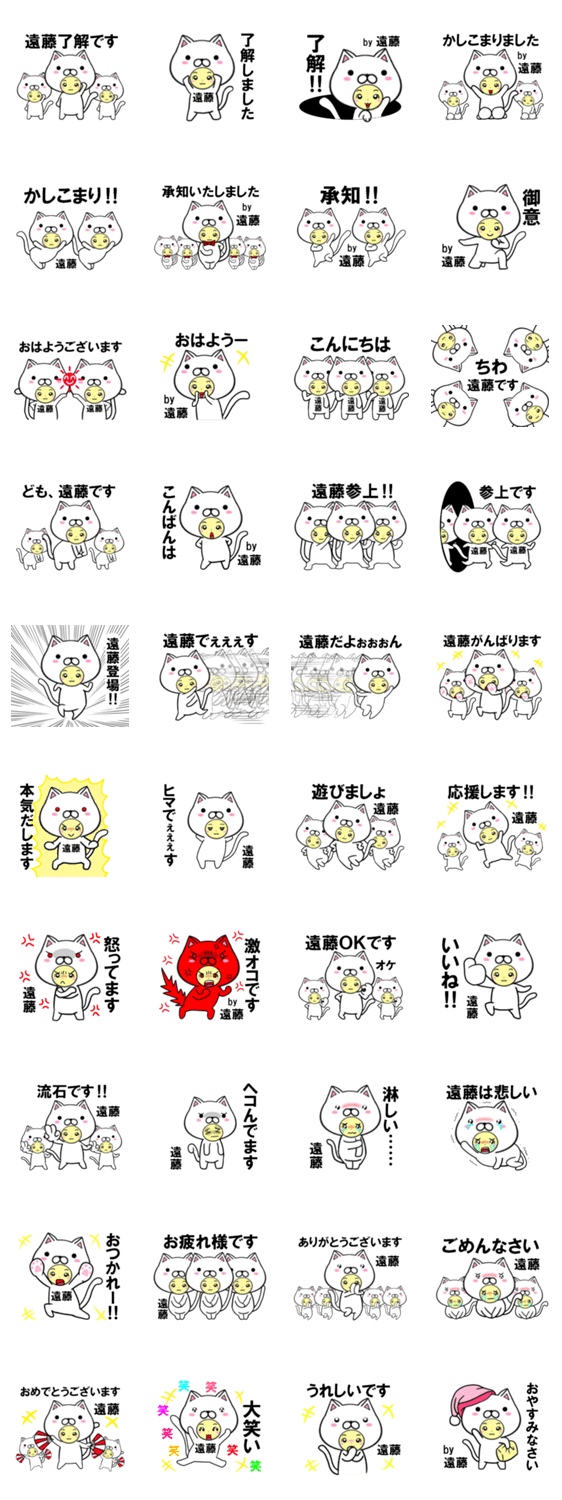 遠藤(えんどう、エンドウ)さん用のスタンプで、ネコの全身タイツを着ています。日常会話で使えます。