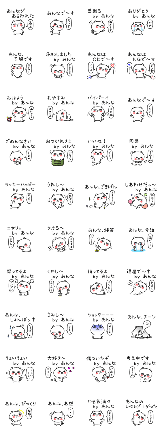 安奈、杏奈、杏南、杏菜、杏那…、全国の「アンナ」さん専用の猫キャラ名前スタンプ、日常会話の基本セットです。友だちとお揃いで使える「ちゃんねこシリーズ」です。
