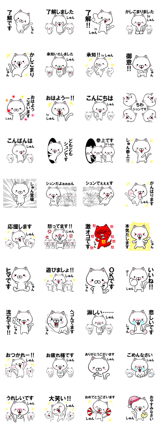 ネコのスタンプで、しゅん(シュン)さん用です。他にも、しゅんじ、しゅんいち、しゅんすけ、しゅんた、など名前にシュンが付く人も使えます。