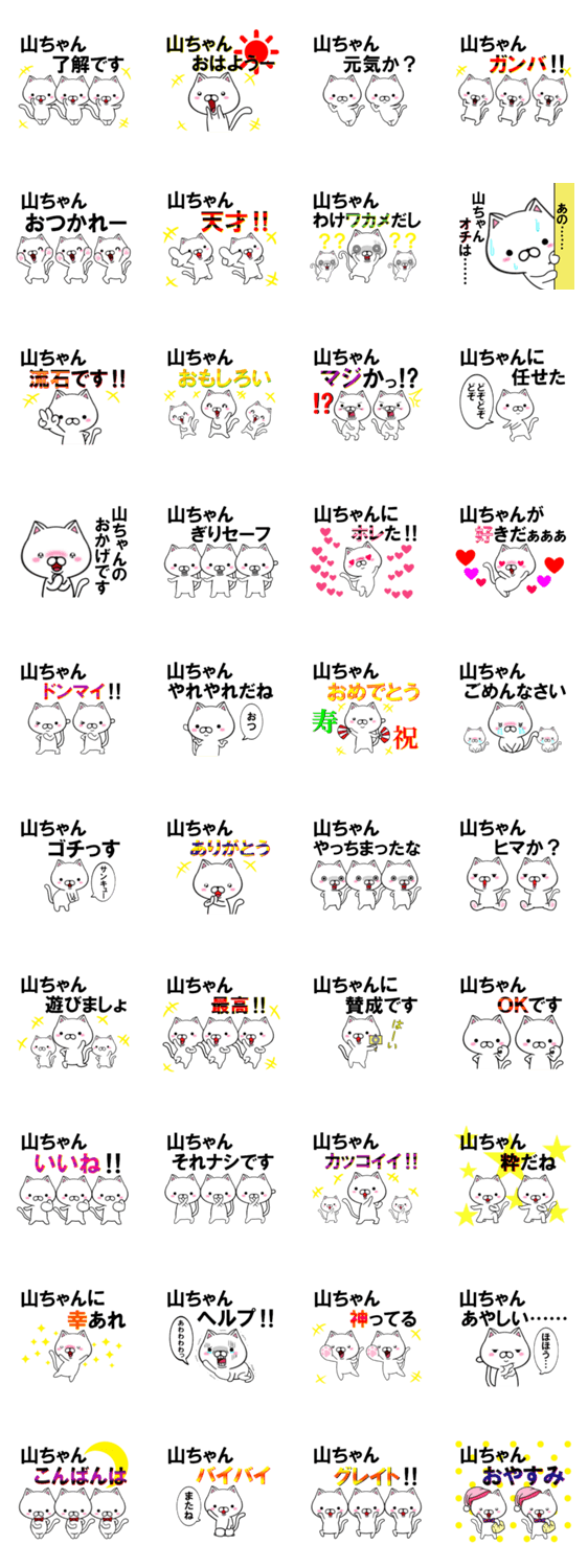 名前が山本、山田、山里、山寺、山根、山川、山口、山下など、あだ名が山ちゃん(やまちゃん・ヤマちゃん)の人に使えるスタンプです。山ちゃんの友達、先輩などが使えます。