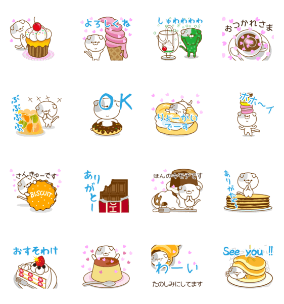大人気スィーツとスコティッシュホールド折れ耳ネコの美味しいコラボアニメーション♡スタンプするたびワクワク気分がアガる⤴癒し系スタンプ♡ゆる敬語で使いやすさも◎