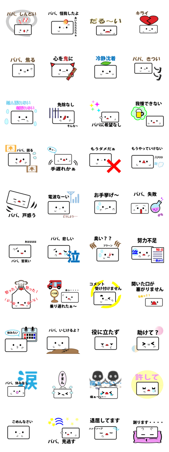 四角の形をしたパパ専用のスタンプ第四弾が登場。家族間で使いやすいスタンプになっています!四角の形をしたパパ(父)のキャラクターで気持ちを家族に伝えてみてください。