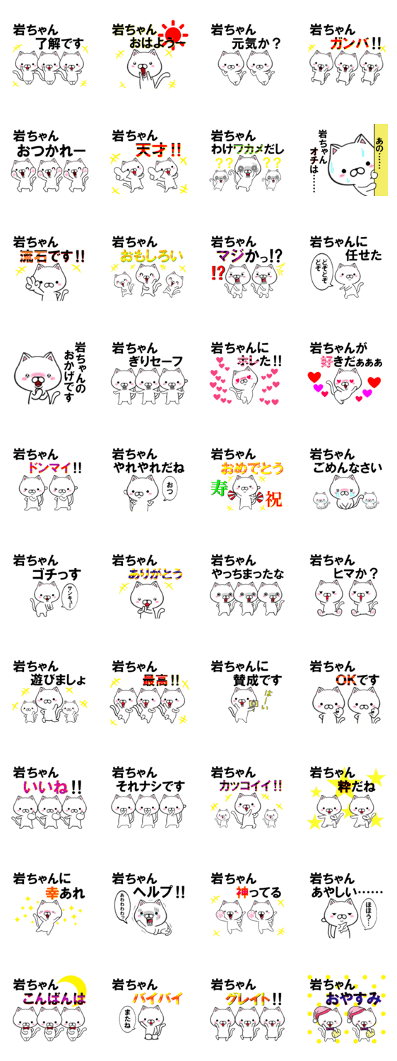 名前が岩崎・岩城・岩木・岩田・岩本・岩川・岩谷・岩口・岩下・岩村・岩藤・岩森・岩上・岩野など、あだ名が岩ちゃん(いわちゃん、がんちゃん)に使えるスタンプです。