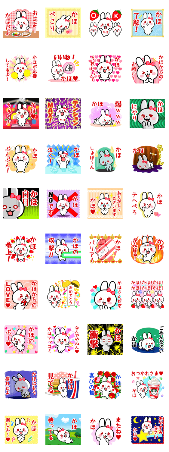 「かほ」ちゃん、「かほ」さんのための名前スタンプです。白いうさぎがかわいく気持ちを表現します。毎日よく使う言葉を集めました。よろしくお願いします♪