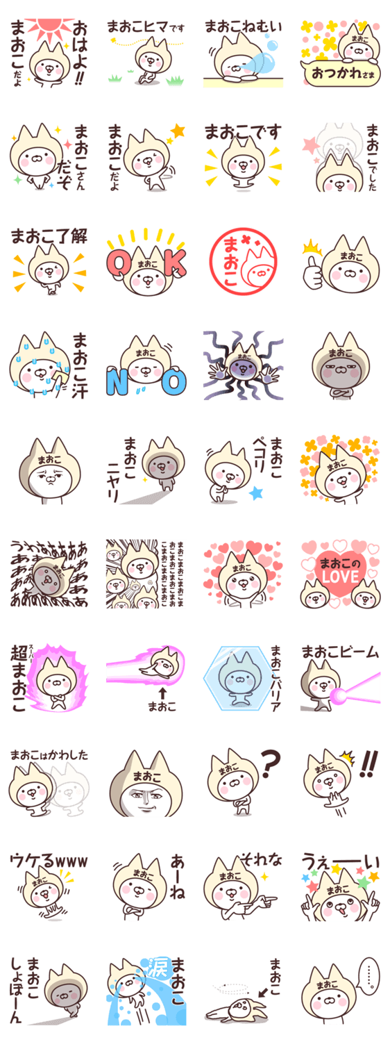 まおこさん、まおこちゃんが使える名前スタンプです。マオコ/真央子/真生子/真緒子/麻央子/麻緒子さんはぜひ。