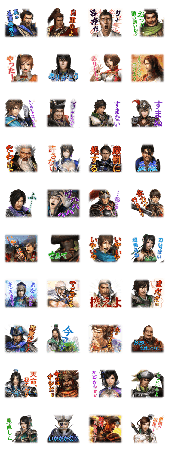 | スタンプ説明 | 一騎当千の爽快アクションゲーム「真・三國無双」のスタンプがついに登場! 武将たちの個性豊かなスタンプでトークを楽しもう! |