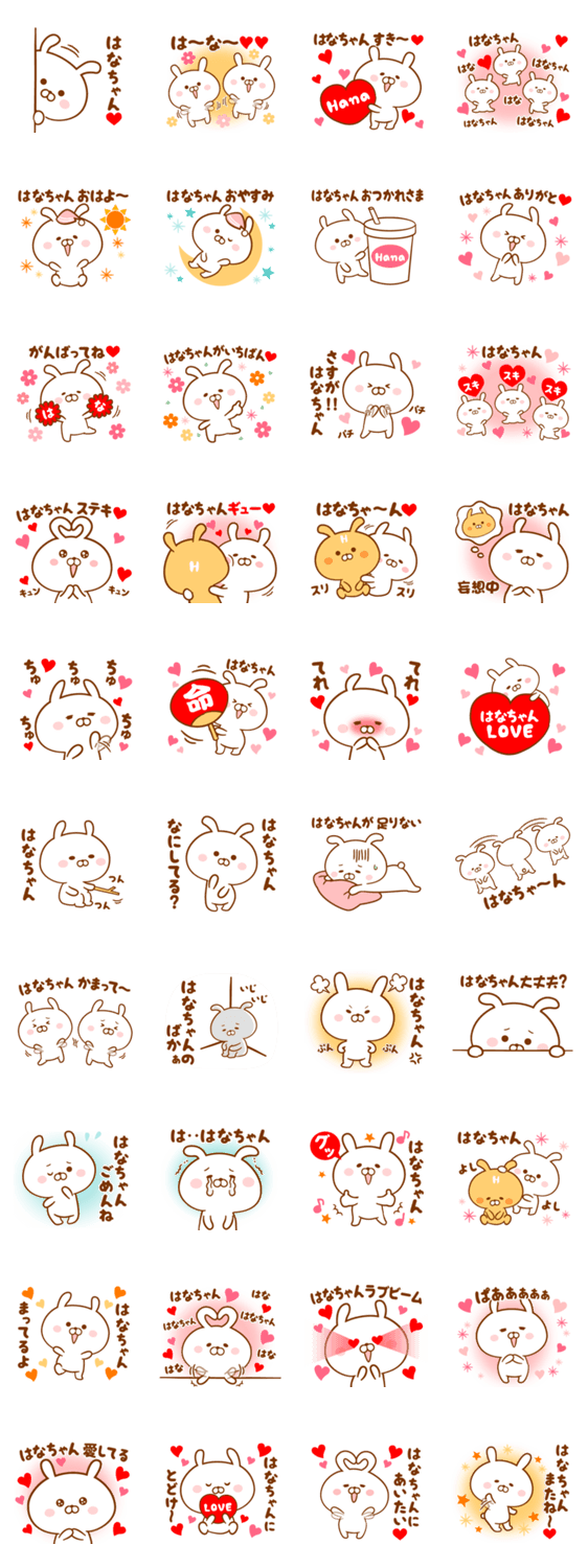 はな/はなこ/はなえ/はなよ/はなか/ハナコ/華/花子/英恵/花田/花岡/花沢 等、はなちゃんに送る名前・あだ名スタンプです。恋人、家族、友達に気持ちを伝えてね♥