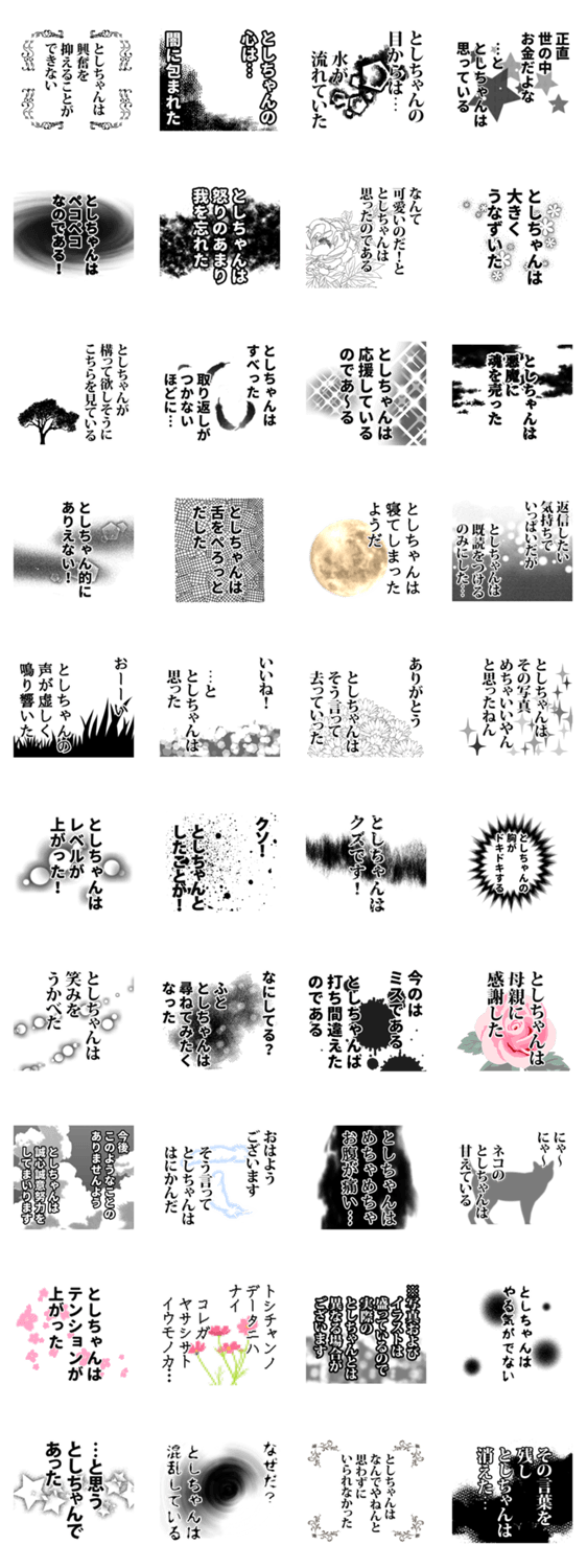 | スタンプ説明 | としちゃん(としこ.としき.としや.としひこ.としゆき.としあき.としお.さん等)トシちゃんのためのナレーション名前スタンプです!モノローグがうけます! |