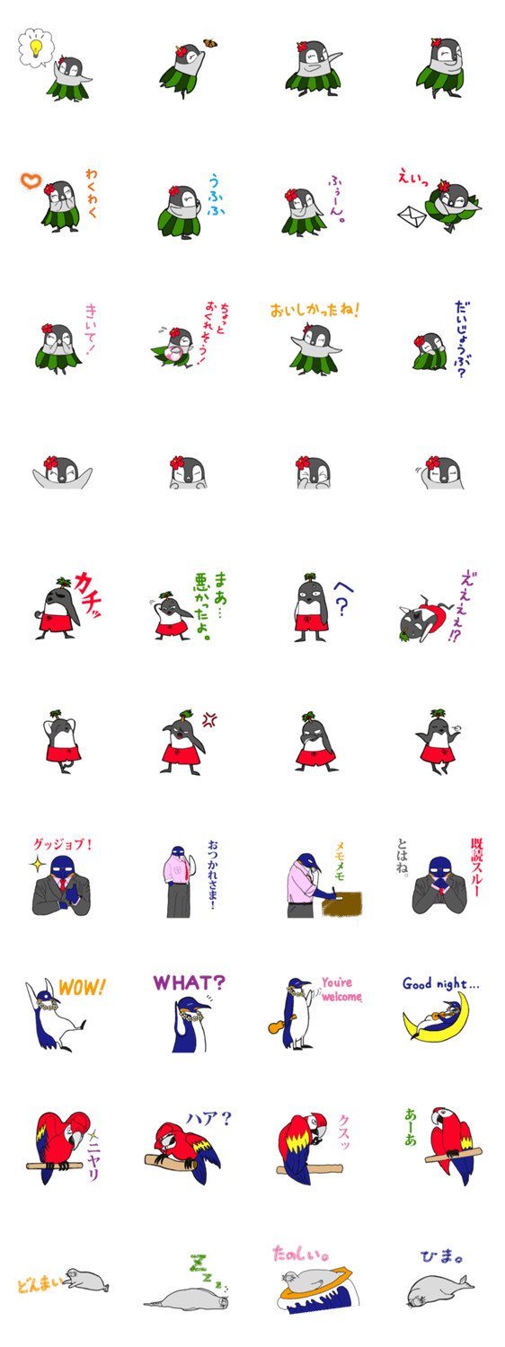 | スタンプ説明 | 南極生まれのペンギンたちが、南の島でフラを踊ったりサーフィンしたり。ファニービーゴーと仲間たちがゆるい毎日を海辺でのんびり暮らす、シリーズ第2弾。 |