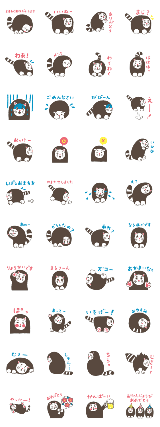 白いお面をかぶっているみたいなネコ、「おめんねこ」のスタンプです。どうぞよろしくお願いします。