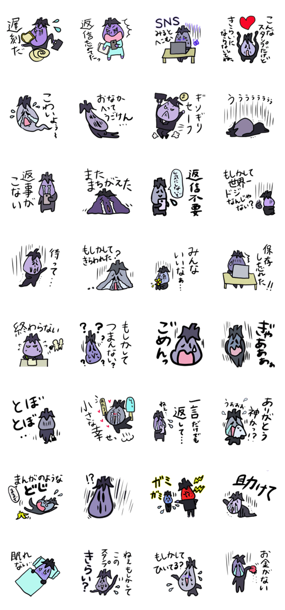 | スタンプ説明 | とにかくドジで悲観的ななすの一日。うざいけど絶望しながら今日も一生懸命生きています。気持ちが分かる人へ。ただしこのスタンプを送るとドンびきされる可能性あり。 |