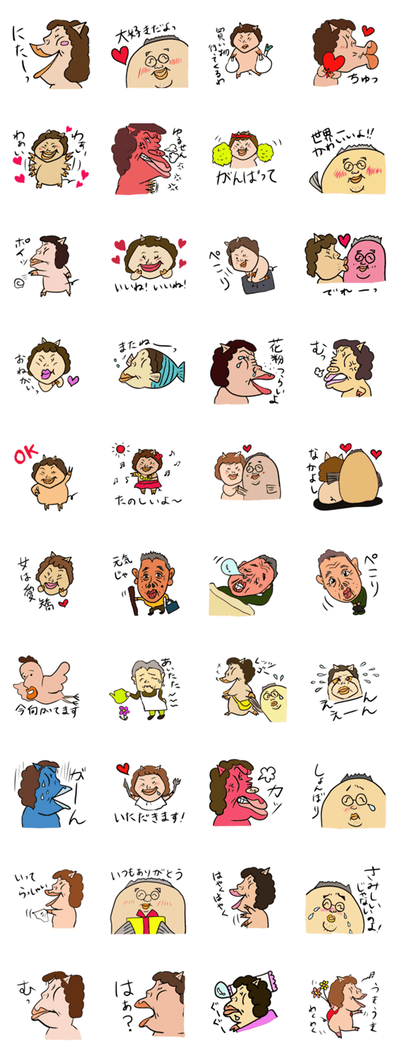 | スタンプ説明 | 愛嬌たっぷりのブタおばさん。 トドのだんなさんに溺愛され、可愛がられて毎日楽しく暮らしています。 怒りっぽくて単純でとっても愛嬌のある表情豊かなおばさん。 |