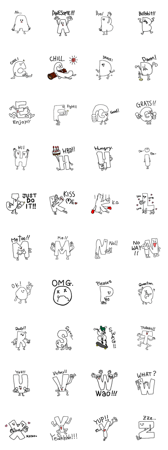 | スタンプ説明 | 超絶渋いアルファベットくんと超絶可愛いアルファベットちゃんがスタンプになったよ!いろいろな使い方を試してみてね♪ |