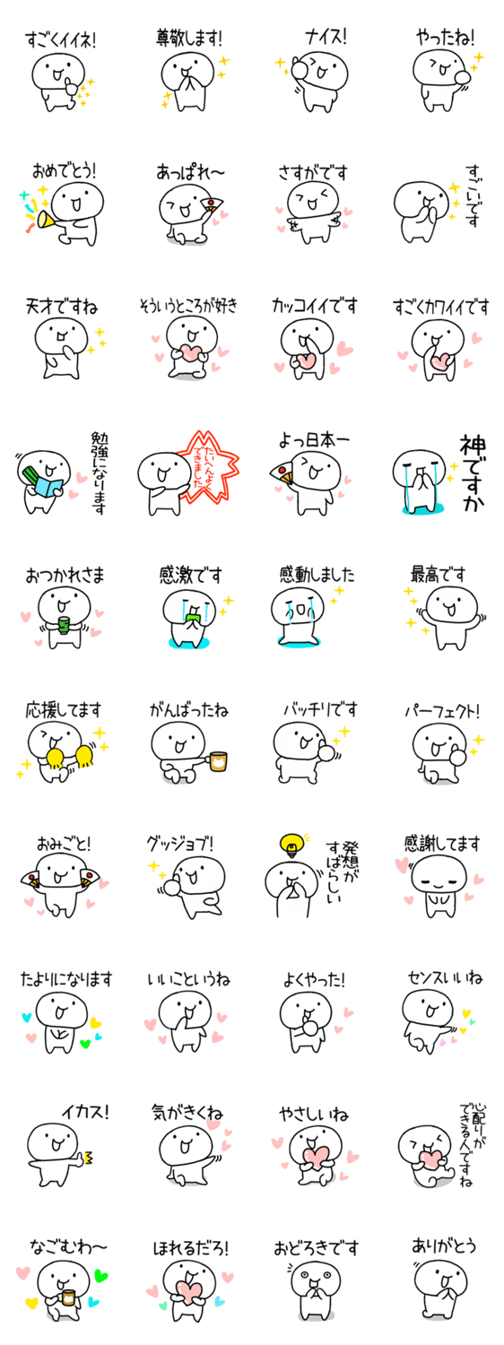 真っ白なしろくてまるいキャラクター「しろまるこ」が褒めまくる「ほめる」スタンプです。良いことをした人や頑張っている人などにお使いください。