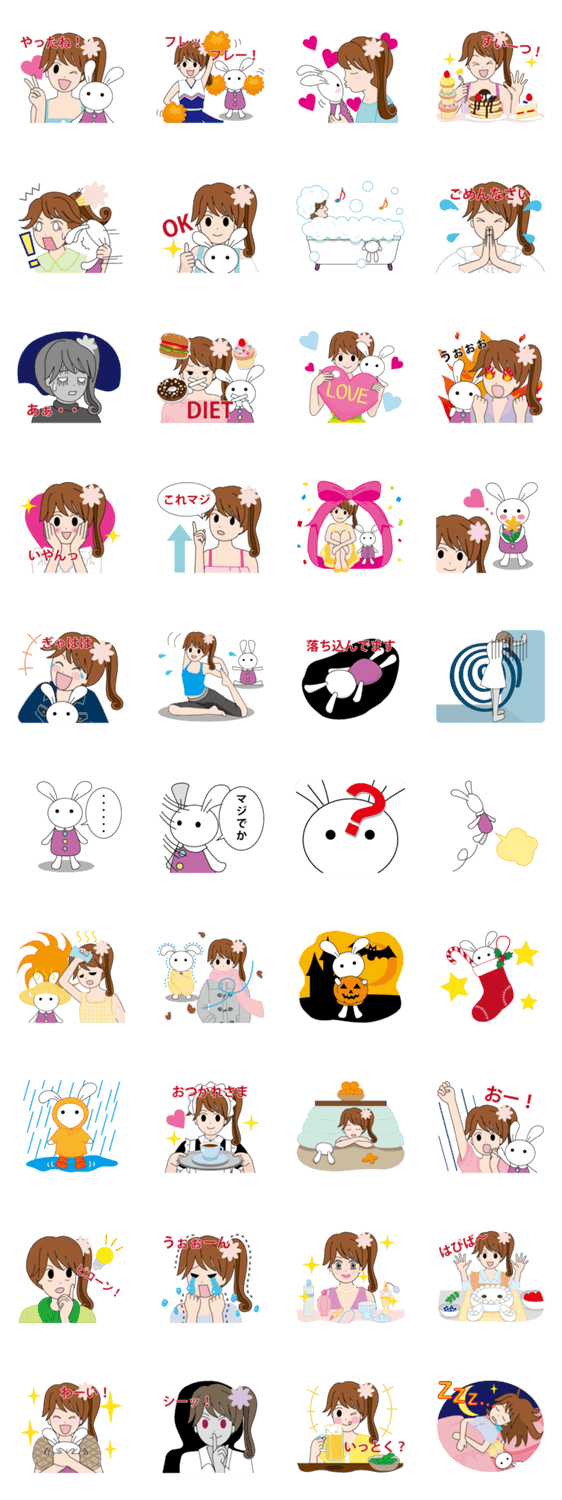 おしゃれが大好きなもえちゃんと仲良しのウサギのぬいぐるみのスタンプです。