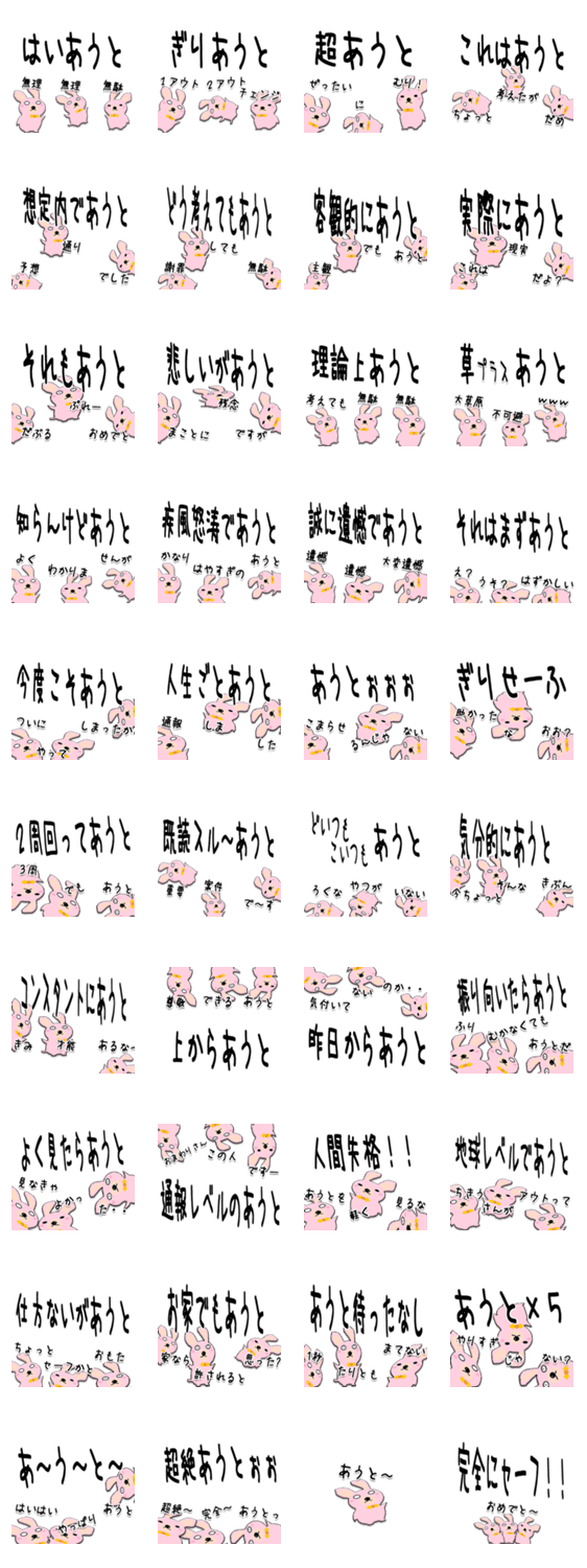 ぎりアウト!これはあうと!等、やらかした方に使ってあげよう。友達同士、恋人同士、家族でも、社畜さんも使えるアウト40個分の力!三匹のウサギの言い分も大事なこと。