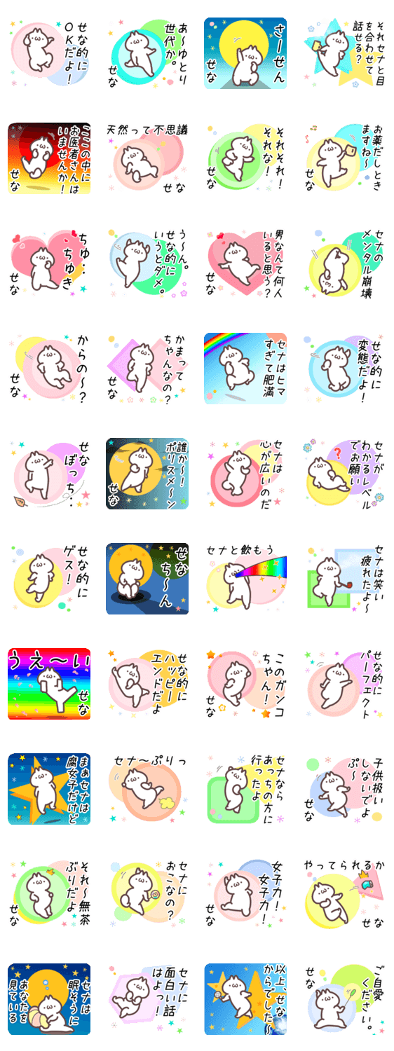 セナ(瀬奈、瀬名、瀬女、瀬那、世奈、星七、星南、聖菜、妹茄、瀬納)等が使用する為のニックネーム、あだ名、せな専用名前スタンプです。ライン生活を楽しみましょう