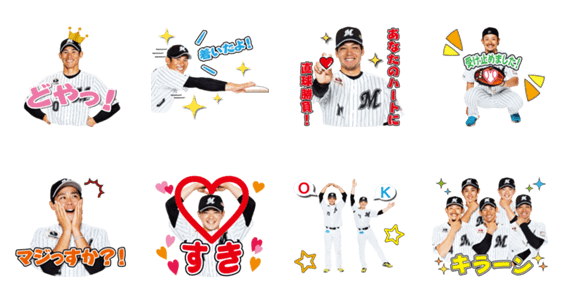 | スタンプ説明 | 女性ファン投票で決まったマリーンズ・イケメン5のスタンプがついに登場!荻野貴選手・佐々木投手・吉田選手・平沢選手・成田投手がスタンプに! |