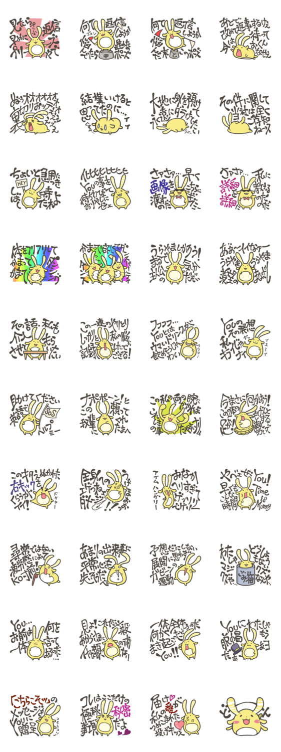 | スタンプ説明 | Zs Kingdomスタンプ第"14"弾! それでは、長文系スタンプをどうぞ。うさぎキャラの文章スタンプ(2)でございます。プレゼントやひっそりトークにお使い下さい。ご愛顧に感謝 |