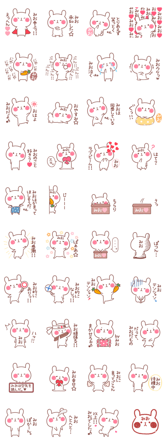 みーちゃん、みっちゃん、みおちゃんが使える名前スタンプ。カップルやお友達ご家族へ、毎日使える自分専用スタンプです。