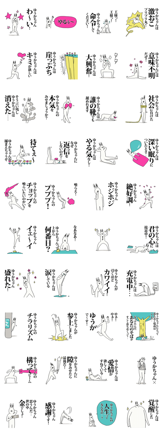 | スタンプ説明 | ゆうかちゃん(ゆうか.ユウカ.優花.優香.優佳.友華.優華.悠花.悠香.佑香.さん等)ユウカちゃんのための名前スタンプです。 |