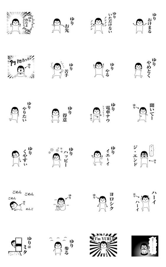 ユリくん、ユリさん、ユリちゃんが使う動く面白名前スタンプ。