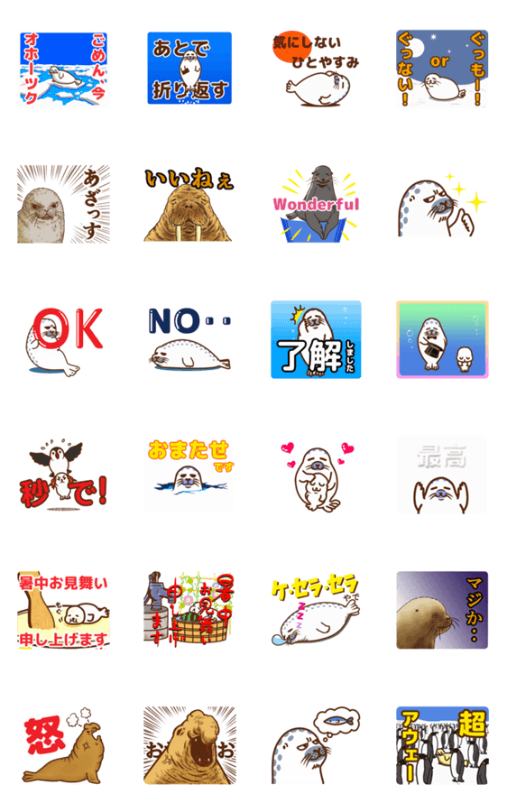 アザラシたちのキュートで笑える、ちょっぴりシュールなスタンプです。ビジネスで使える挨拶・丁寧語はモチロン、ユニークな煽りやネタ系、この季節嬉しい暑中お見舞いも!