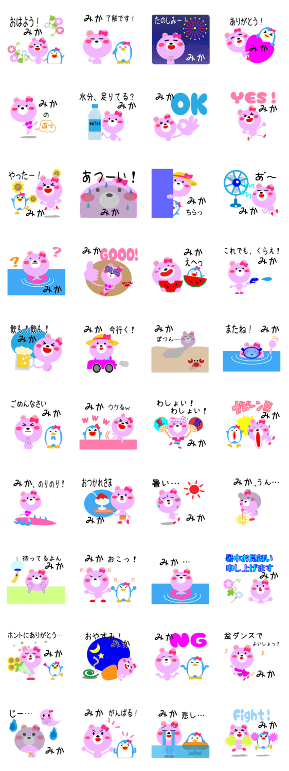 みかちゃん(さん)の名前スタンプ夏バージョンです! お友達のペンギンちゃんも一緒です♡ しおんのスタンプを宜しくお願い致します。(#^.^#)