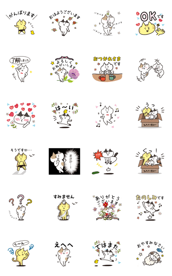 動く!毎日使える[まゆげ猫たちの日常]ゆる敬語、丁寧語Ver。癒し系猫たちを日常会話に添えて。やさしい大人のことばで、お仕事や主婦、仲良しのママ友への返信にも最適。