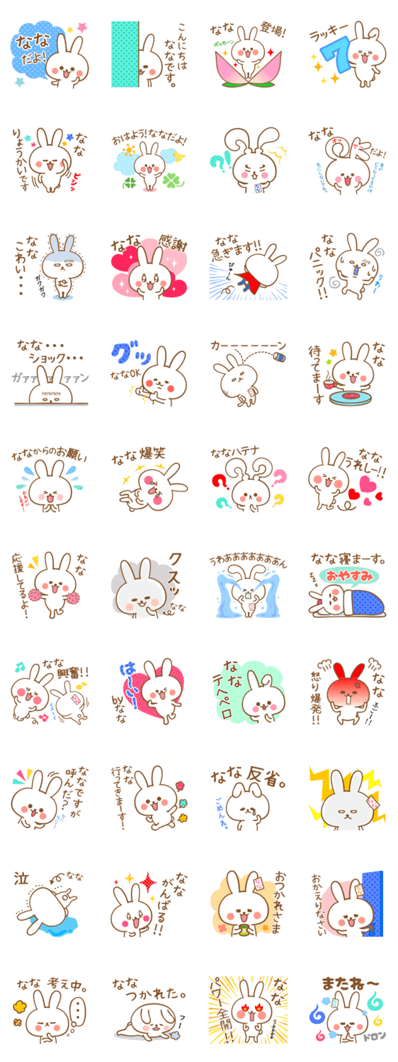 [なな]が日常生活で使いやすい、名前/あだ名スタンプです♪[ナナ/ななこ/ななみ/ななか/ななお/ななえ/nana/奈々/菜々/那奈/奈南/七菜]等、ゆる可愛いウサギのキャラです。