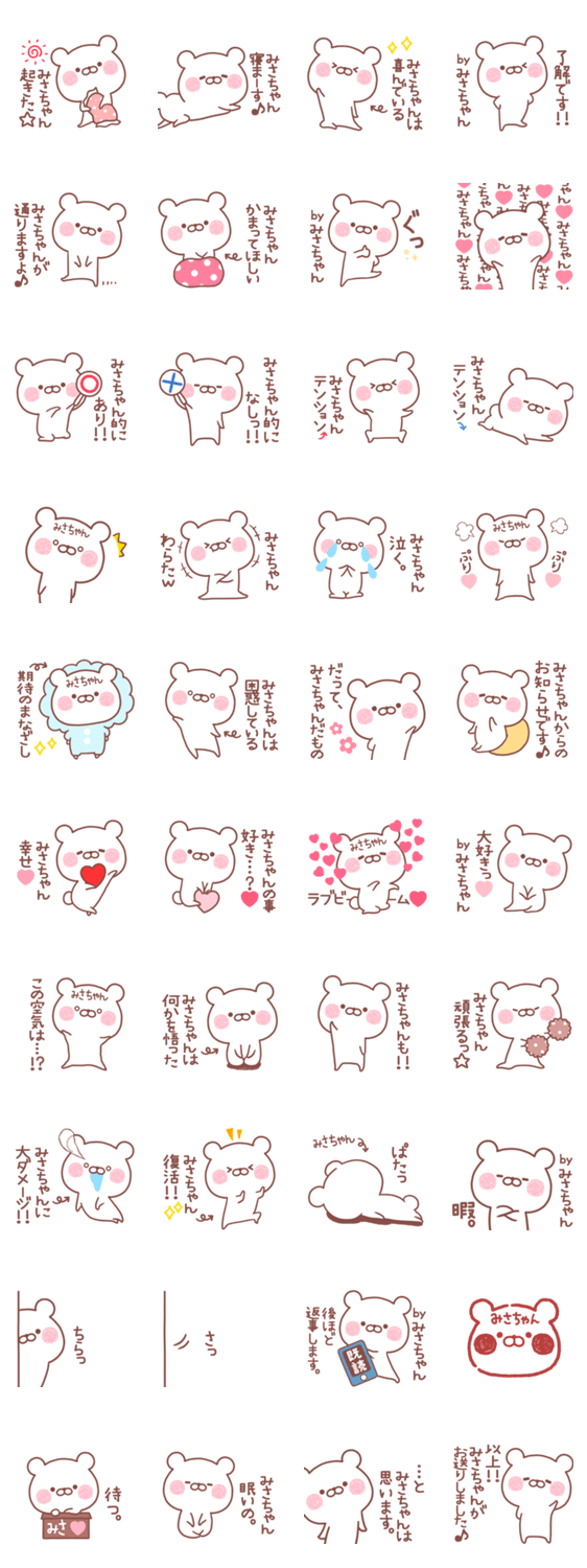 みさこ、みさえ、みさか、みさな、みさや、みさき、みさと、みーちゃん、みさちゃんが使える名前スタンプ。カップルやお友達ご家族へ、毎日使える自分専用スタンプです。