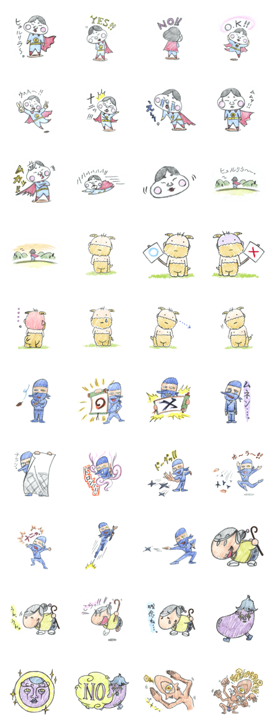 | スタンプ説明 | ヒーローに憧れる"おてもやん"とその友達で半獣半人の"ヤギジン"や"ザ・ニンジャ"など愉快なキャラがLINE Stampに登場!あなたの喜怒哀楽を彼らがビミョーに表現するよ! |