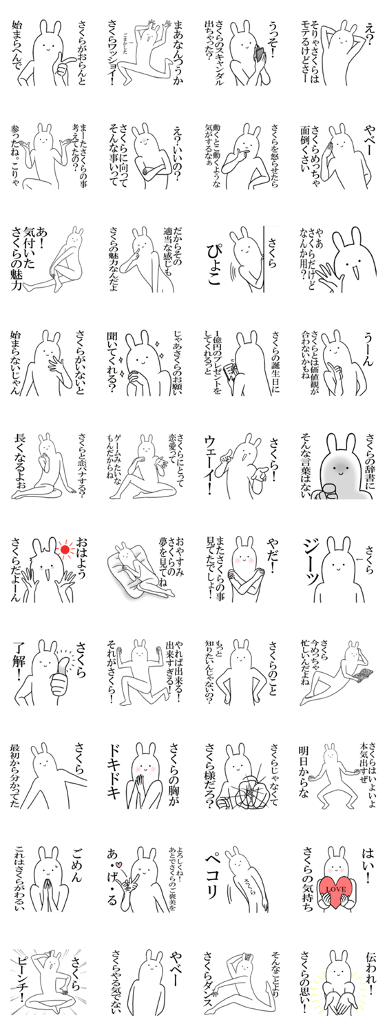 さくらちゃんが使えるシュールな名前スタンプ。さくら,サクラ,桜,佐倉,櫻,咲良,紗倉,咲久良,佐久良,作楽,早久良,紗久良,桜良などさくらちゃんが使えるスタンプだよ
