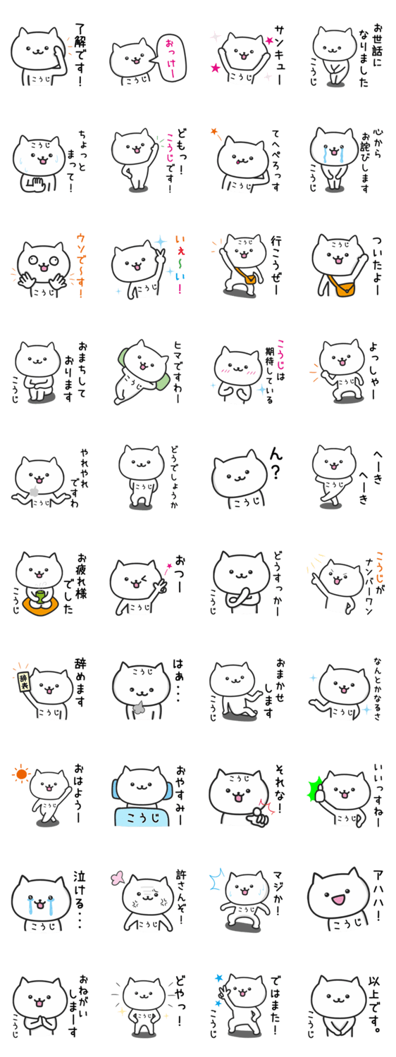 「こうじ」専用の名前スタンプです。日常会話で使える基本セットです。浩二,浩司,幸治,幸司,康二,広司,浩志,孝司,浩史,康治,幸二,孝二,弘二,孝志,宏司,光司,宏治,孝治など