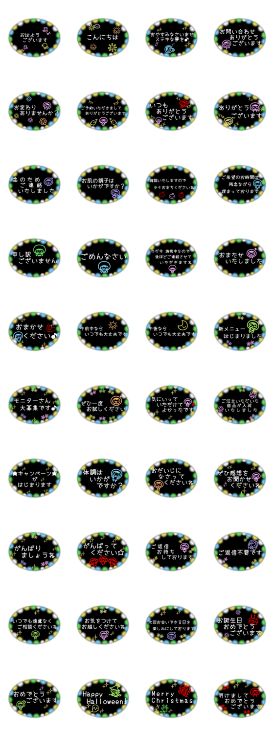 接客業(エステ・美容師さんなどなど)で使えそうなスタンプ、 大人っぽい黒バージョンです。 施術中などで文字を打っていられない~! そんな時にも重宝します♪