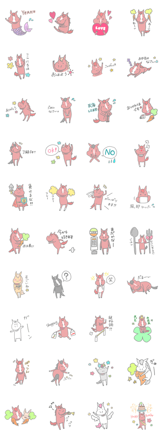 | スタンプ説明 | 馬ですがのスタンプ第2弾。 ついに馬たちが二足歩行を始めたようです。 |