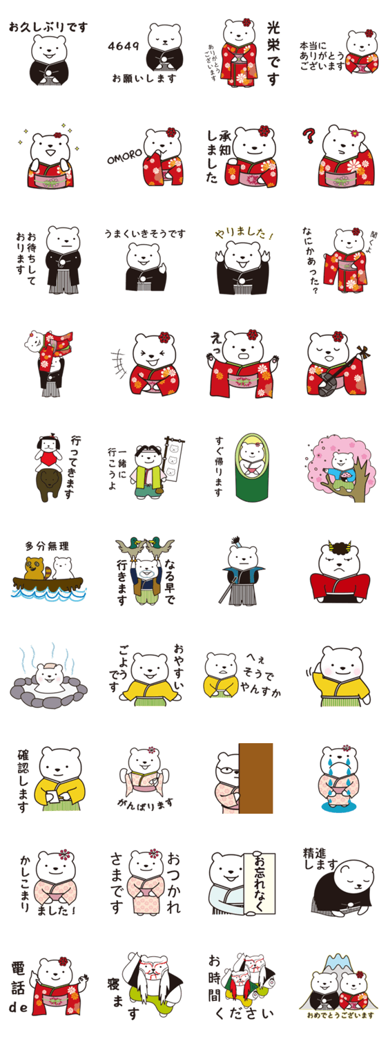 | スタンプ説明 | 着物で正装したファニーフェイスなシロクマヤルケとカルッピの和風スタンプ。敬語もあり、先輩や上司、ビジネスにも使えるおもしろキュートなスタンプです。 |