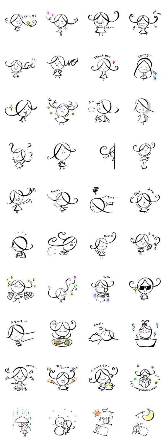 ピンピンした髪の毛が感情とシンクロしてる女の子「pin子ちゃん」のスタンプです。