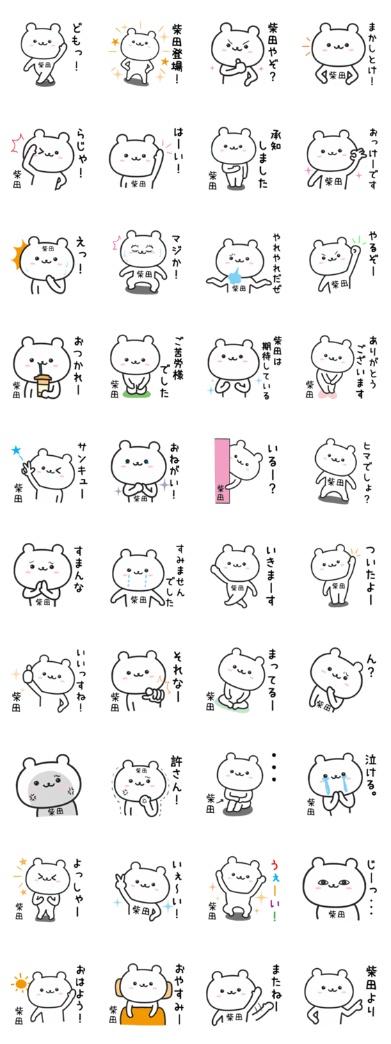 名字(苗字)が柴田(しばた)の方が使える、くまの名前スタンプです。日常会話で使いやすいシンプルな基本セットです。柴田さんへのプレゼントにも。