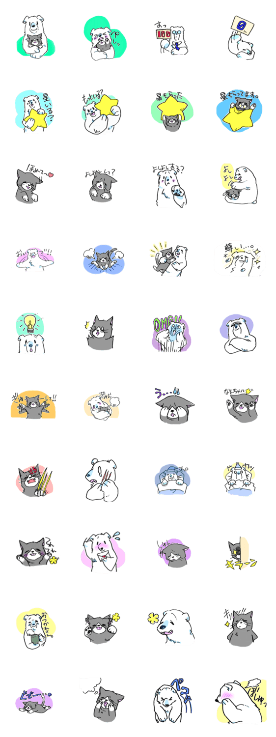 シロクマのくまたと、グレーのハチワレ猫のぽんたのゆるめなスタンプです。